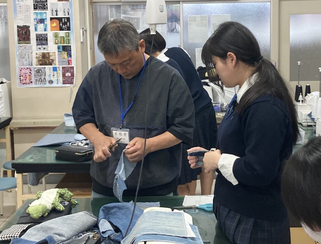 授業の冒頭には、竹内氏よりリメイク事業への思いや、アップサイクルの魅力についてお話をいただきました。その後、生徒たちは 廃棄予定だったジーンズを裁断し、自分のデザインに合わせて縫製を進めていきました。
